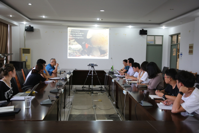On August 29, at the invitation of the Polar Research Center of SHOU and the Ministry of Education Key Laboratory for Ocean Fishery Resources Sustainable Development and supported by Sino-Australian Joint Research Centre for Ocean Engineering, Dr. Maria Mercedes Santos, research fellow of IAA and Vice Chairman of the Scientific Committee of the Commission for the Conservation of Antarctic Marine Living Resources (CCAMLR), paid a visit to SHOU, and presented an academic report entitled “The Ecosystem Program from the Instituto Antarctico Argentino”. Some teachers and students from the International Performance Research Center for Pelagic Fishery, the College of Foreign Languages, and the College of Marine Ecology and Environment attended the seminar. The seminar was presided by Professor Zhu Guoping from the Polar Research Center.